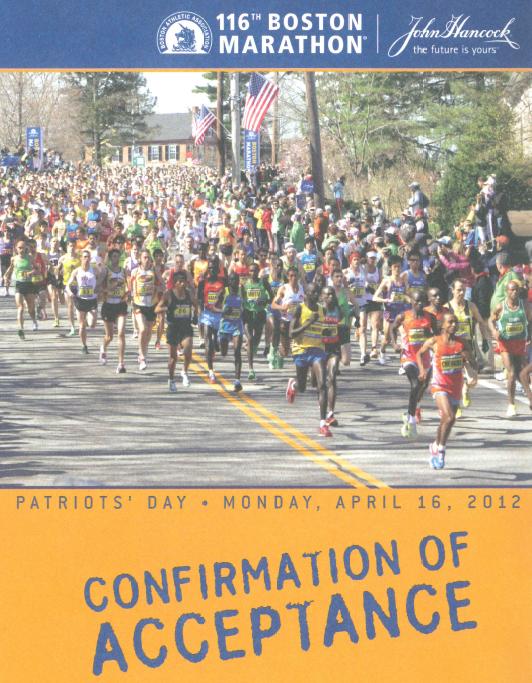 This is to notify you that your entry into the 116th Boston Marathon on Monday, April 16, 2012 has been accepted, provided that the information you submitted is accurate.
