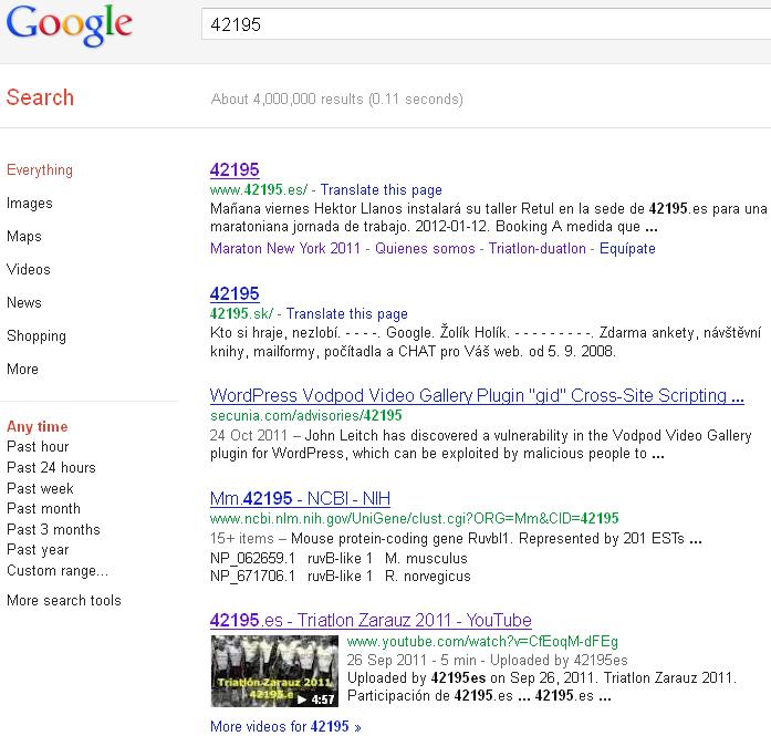 Durante la búsqueda de "42195" en Google, el resultado # 1 no es un punto COM sorprendentemente, es un punto ES que se ha convertido en número 1, gracias a la publicación de artículos y fotos de los participantes en carreras"