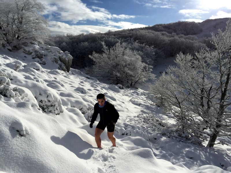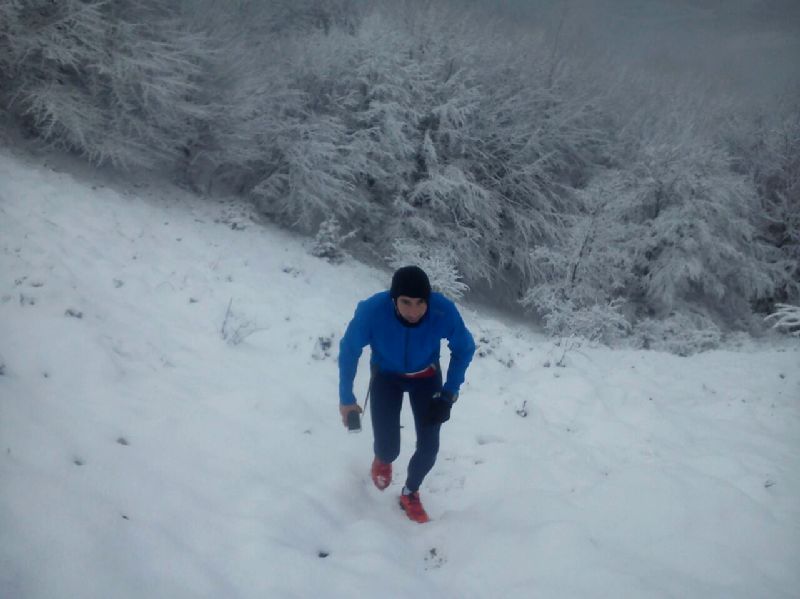 "Aprovechando la nevada, el sabado 17 de enero 2015 nos lanzamos al monte en busca de la nieve. Comenzamos el entrenamiento de Araia con 0°C de temperatura con la idea de hacer el Aratz y el Aizkorri. Desde que salimos de Vitoria y nos íbamos acercando a Araia ya veíamos toda la sierra del Aizkorri nevada. Efectivamente enseguida ya nos encontramos con los primeros mantos blancos de nieve nada más empezar.
