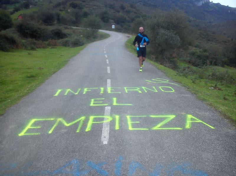 Claro que ya estaba avisado que lo complicado comenzaba a partir del km 6. Así es. Veo en el asfalto grabado en amarillo fosforito una alentadora frase: "El infierno comienza" (acompañada de un tridente). Ale pues, para arriba, no hay más remedio. Observo el reloj y veo que puedo estar en tiempos de 1h:20m (el objetivo más optimista que llevaba desde la salida se estaba cumpliendo). Ingenuo de mí. Las rampas comienzan a ser verdaderas paredes con sus durísimas horquillas y mis piernas las empiezo a encontrar muy cansadas y los gemelos me dan pequeños avisos de calambres.