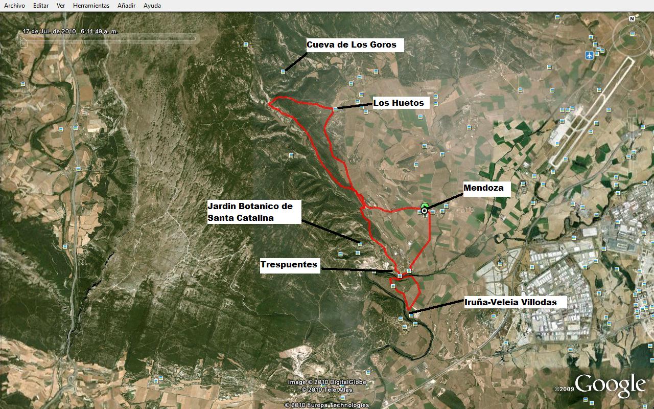 Apenas tenemos víveres y el agua empieza a escasear. La expedición, ya sólo con 5 supervivientes, sale desde Mendoza con la esperanza de encontrar el camino de vuelta a casa. Tras abandonar el poblado, nos adentramos en terreno agreste de senderos angostos. Poco más adelante divisamos las primeras casas de Hueto Arriba, pero nos decantamos por seguir el escarpado camino que sube hacia la cruz de Ganalto….quizás desde allí tengamos una mejor visión del horizonte. La dureza del relieve obliga a descolgarse a algún miembro del grupo. Es importante mantener la unidad, por lo que decidimos esperarle. Ante estas primeras muestras de flaqueza, desechamos la ruta ascendente y decidimos cambiar nuestro rumbo en dirección sureste. Tras atravesar una zona de campo abierto, comenzamos un descenso vertiginoso con pronunciadas pendientes y curvas imposibles. La integridad del grupo está en peligro. Tras unos momentos de indecisión y tras el reagrupamiento, decidimos continuar a través de un bosque de encinas hacia Iruña-Veleia, dejando atrás la ermita de Santa Catalina. El ascenso al Opidum es agotador, pero estamos en un punto de no retorno. Tenemos a la vista la aldea de Víllodas, a la cual llegamos sin adentrarnos. El tiempo se echa encima y es hora de intentar el regreso al punto de partida. Volvemos por Trespuentes, y tras recoger algo de documentación acerca del puente romano, regresamos definitivamente a Mendoza.