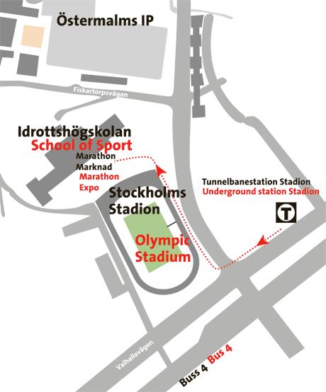 El Expo Maratón se encuentra justo detrás del estadio Olímpico. Para llegar hay que tomar el metro hasta la estación Stadion. También puede tomar el autobús número 4.