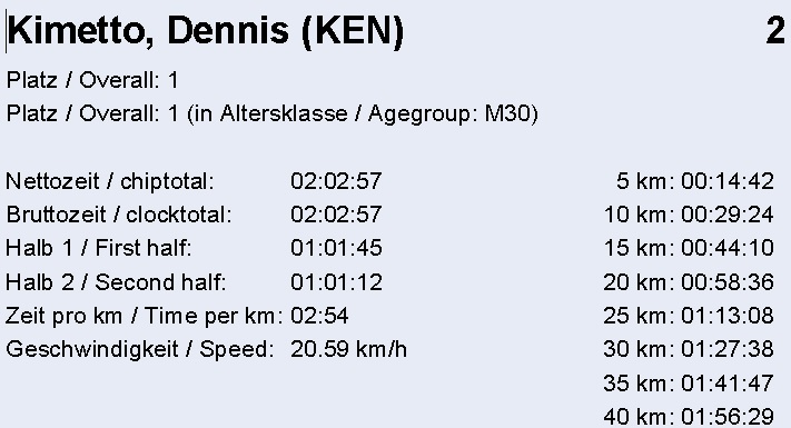 En esta ocasión ha sido Dennis Kimetto a una media de 20,59 kilómetros por hora, a 2 minutos y 54 segundos cada 1.000 metros, haciendo la segunda media maratón 33 segundos más rápida que la primera (lo que se dice correr en positivo)