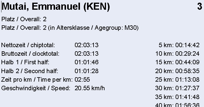 Destacar también la carrera de Emmanuel Mutai que con 2 horas 03 minutos y 13 segundos habría batido también el anterior récord de Wilson Kipsang por 10 segundos.
