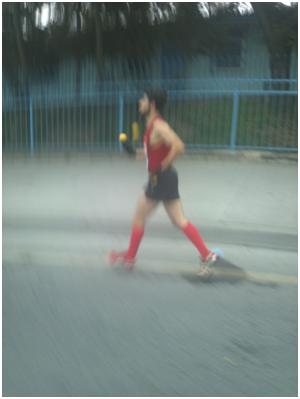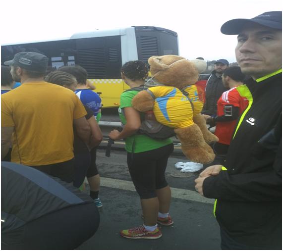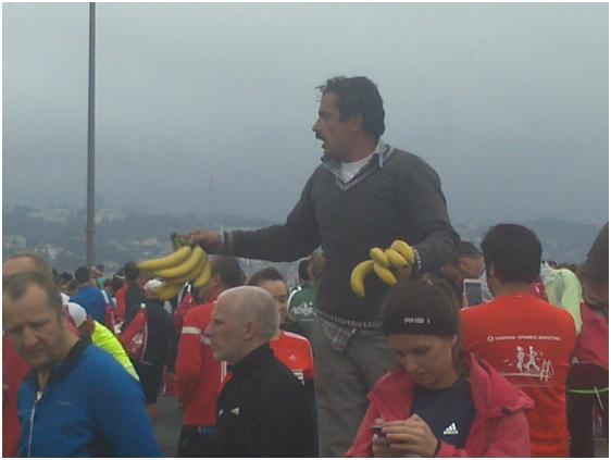 En cuanto al maratón se podría definir como el más friky en el que hemos estado, raros, poco profesionales e imposibles para mejorar marcas. La organización se complica la vida tanto en traslados a la zona de salida, como en la propia salida donde se mezclaron todo tipo de personas que disputaban distintas modalidades (desde personas andando mezclados entre corredores de carreras cortas, medias y maratón) y equipamiento (desde zapatos, tenis, meybas, pantalones de vestir, chándales y cualquier ropa deportiva que os podáis imaginar, uno estaba corriendo con una chupa de cuero marrón atada a la cintura). En especial a estos tres: el vendedor de plátanos en la salida, la chica con la mochila de monte y el oso y la figura que se calzó los 42195 metros haciendo malabares con tres pelotas.