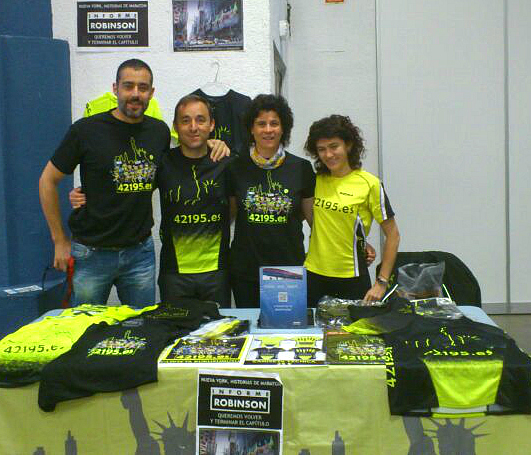 El sábado por la mañana nos acercamos a la feria del corredor, a recoger los dorsales, estaba muy animada, los stands a tope de gente, una vez recogida la bolsa del corredor, nos acercamos a la mesa del 42195.es, allí estaban Julian, Laura, MariJose y Jose, Carlos, junto con Alaia vendiendo camisetas, ellos han sido los que han atendido durante los tres días el espacio cedido por la organización y que junto con los de otras carreras nos están dando la oportunidad de vender camisetas del 42195.es para poder volver a NY y terminar nuestro capítulo inacabado. La gente se acercaba, nos dice que nos han visto en el Informe, que tenemos que volver, se paran, compran, se sacan fotos, etc., es un placer charlar y sobre todo el entusiasmo con el que nos animan y nos dicen que hay que volver.