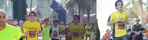 Sigo corriendo a gusto y sin forzar y los kilómetros van pasando poco a poco. Cada 3 o 4 aparece alguna batucada que me pone los pelos de punta y aumento el ritmo sin darme cuenta. A mitad de carrera pasamos por el Arco del Triunfo donde la gente anima a tope y te pega el subidón. Todo va bien pero por si acaso me tomo uno de esos geles energéticos que algo no se si harán pero psicológicamente si que funcionan. Sigo a ritmo de 4' 30 pero las piernas cada vez pesan más y no voy tan suelto. En el kilómetro 15 deberían estar mis amigos para animarme y sacarme alguna foto pero...no están. En su lugar otra batucada me da fuerzas para terminar. Encaro los últimos kilómetros calculando mentalmente mi tiempo final pero sin ningún tipo de presión y disfruto de la llegada.