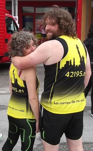 A pesar de la lluvia la animación fue constante tanto por la gente de los pueblos y barrios por los que cruzábamos, como por las bandas de música y cantantes que la organización había colocado para animar. Avituallamientos cada cuatro kilómetros más o menos, en los que el té frío con limón era la bebida que nos reponía, nos iban dando las fuerzas para seguir adelante con nuestra carrera en pareja.