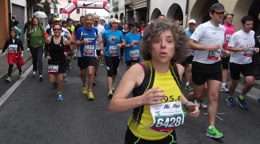El sol lucía en Padua y auguraba una carrera calurosa pero el domingo amaneció fresco y nublado. La organización dispuso autobuses para acudir al punto de partida, en Camposampiero, ciudad en la que falleció el santo de Padua, San Antonio en 1231. Corredores de todas las edades, que daban una idea del carácter tan popular de esta carrera, esperabamos la salida entretenidos con los que pasaban de la maratón, entre los que pudimos ver un valiente bien entrado en los sesenta haciendo los 42195 metros marcha atrás.