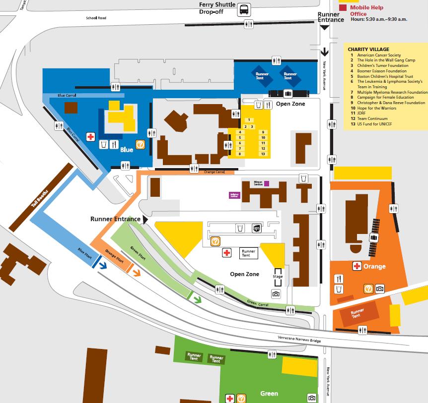 Para acudir al punto de salida los corredores más experimentados recomiendan coger el ferri en Staten Island. Es fácil de llegar al ferri (Whitehall Terminal Ferri al extremo sur de Manhattan) de la mayor parte de Manhattan en metro. Desde la zona de Times Square se llega en menos de 20 minutos. Sería la línea de metro 1 y R, si estás cerca de ellos, se paran en la terminal del ferri. También puede tomar el autobús o el taxi. Los transbordadores corren cada 15 minutos, tienen un montón de espacio y muchos baños. El ferri tarda unos 30 minutos y es un hermoso viaje que pasa la Estatua de la Libertad. En el lado de Staten Island hay una gran cantidad de autobuses esperando para llevarte los 3 kilómetros hasta la zona de salida.