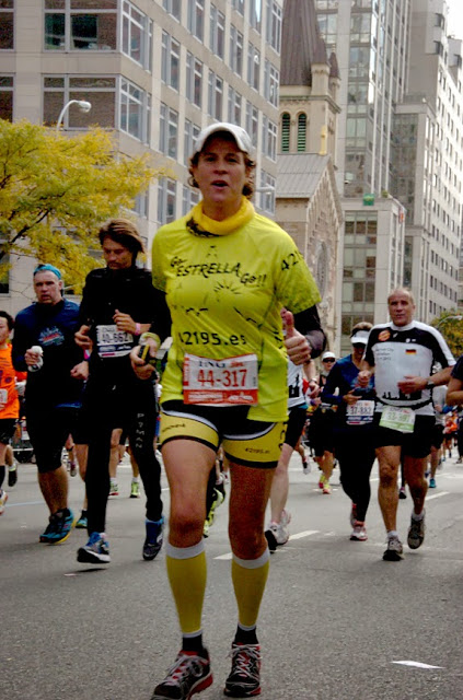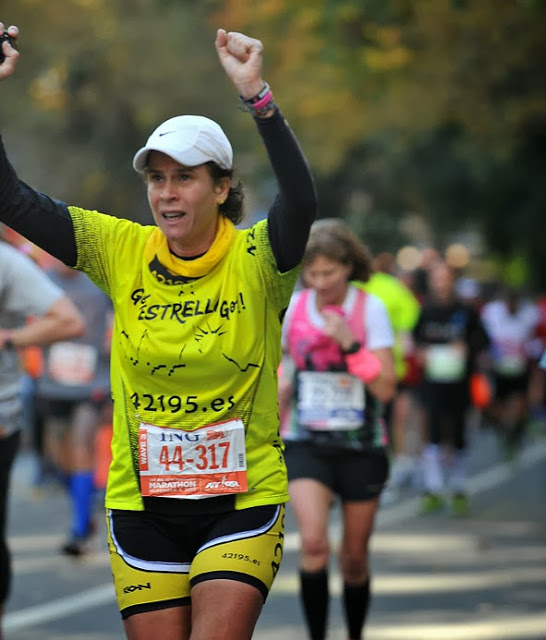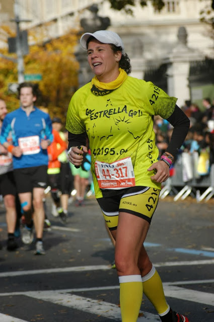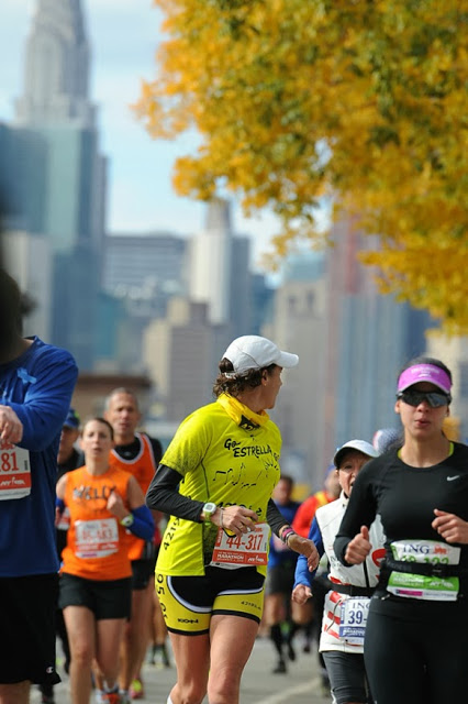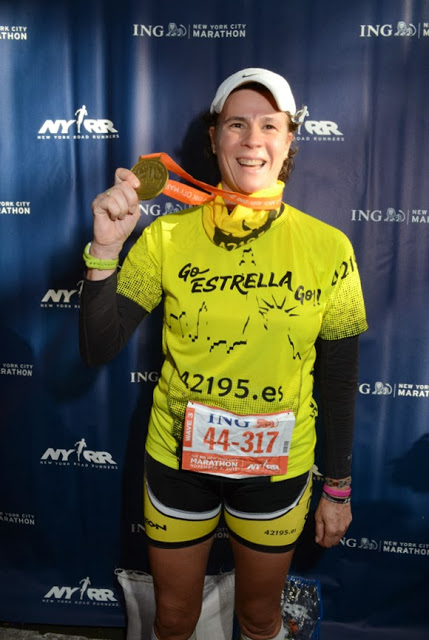 Se me había ocurrido una semana antes de ir a NY, serigrafiar por delante de la camiseta mi nombre y me puse "go Estrella go", de manera que si me daba algún bajón, me lo viese y me animase, pues............no fue necesario, en ningún momento fue necesario, porque, fue tremendo la cantidad de gente que lo leía y me animaba, oí mi nombre, creo que en todos los acentos, la gente latina me decía Estrella, eran los únicos que lo pronunciaban bien, y los demás, jajajaja.....¡¡Estrelaaaaaaaaaaaa, Estreiiliaaaa!!.... jajajaja yo saludaba a tod@s, nunca he realizado este gesto tantas veces, en agradecimiento.