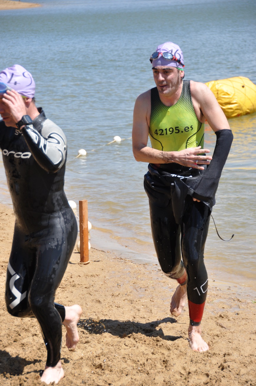 Bocinazo de salida y empieza la carrera. Yo me mantengo en la parte de atrás, para evitar barullos y que me pasen por encima. Hice la natación en 33 minutos, para unos 1686 m que me salieron en el GPS, bien, un poco más rápido que lo que hago en la piscina. De todas formas, en el agua no está mi guerra, el objetivo para mi es nadar a gusto, sin recibir golpes ni que me pasen por encima, y poder salir del agua con energías para arrancar con la bici.