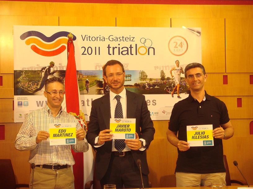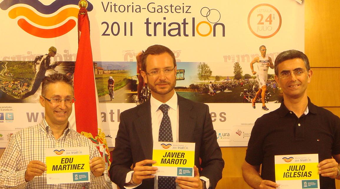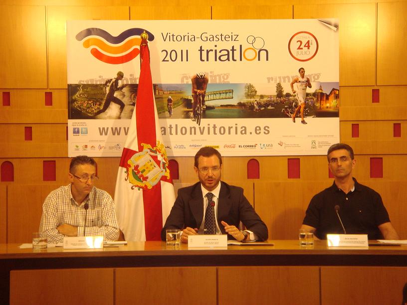 Ayer se presentó de forma oficial el Triatlón de Vitoria-Gasteiz que se celebrará este próximo domingo 24 de julio. El acto se celebró en el Ayuntamiento, con la presencia del Alcalde Javier Maroto, del Presidente de la Federación Alavesa de triatlón Julio Iglesias, y Eduardo Martínez, Director de Ascentium, entidad organizadora de la prueba.