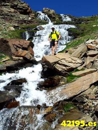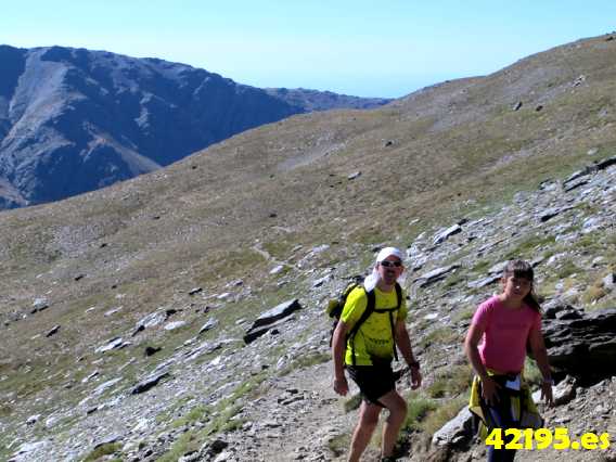No soy capaz de seguir el ritmo que ponen mis dos acompañantes. ¡¡Joder!!, y ¿yo quiero ir al Mont Blanc? Enseguida lo entiendo. Llevo dos días muy duros y la subida al Mulacen que he hecho muy rápido, me ha desgastado bastante. De cualquier forma, intento seguir su ritmo alucinando con mi hija que no se cansa y parece que disfruta bajando a toda pastilla.