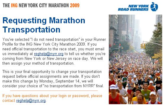 Fer nos avisa del último aviso que le ha enviado la organización para el traslado el día de la Maratón de Nueva York. Al que le haya llegado el mismo aviso, que se de prisa, porque el plazo caduca el 14 de Septiembre... en nuestro caso, saldremos desde New Jersey.
