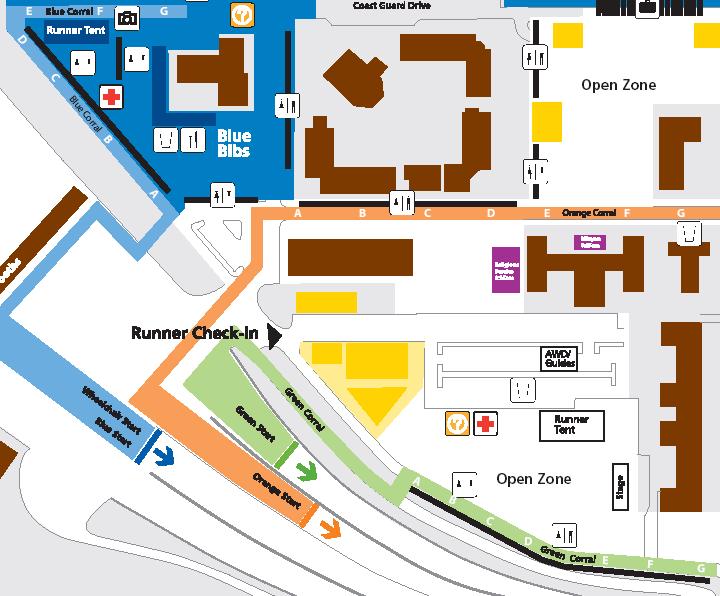 Baños portables (incluidos los adaptados para sillas de ruedas) estarán situados en cada milla, empezando con la milla 3. Estos sitios estarán señalados.