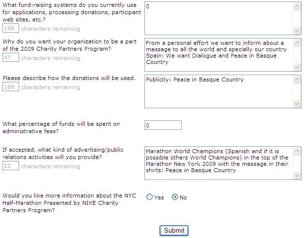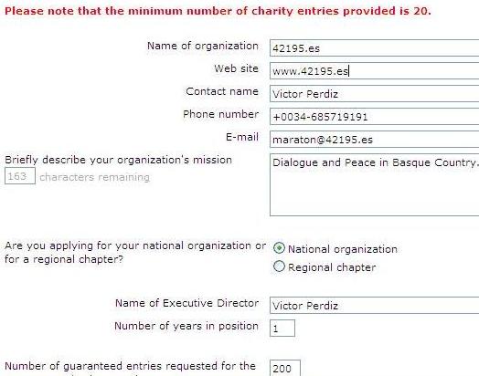 A finales de Noviembre 2008 (en plazo) 42195.es ha solicitado 200 dorsales. Nuestro fin de mejora de la comunidad: "Dialogo y Paz en el País Vasco". Adjuntamos la solicitud y la respuesta de la organización.