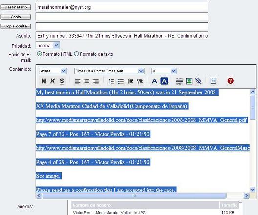 Una vez inscrito en la Maraton Nueva York 2009, si tienes derecho a dorsal por tiempo (en Media Maraton o Maraton homologadas) hay que enviar un email a la organización demostrando el tiempo realizado. Un ejemplo, vale más que mil explicaciones: