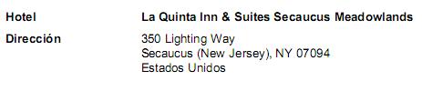 Estos precios son en el Hotel La Quinta Inn & Suites Secaucus Meadowlands de 3 estrellas e incluye: impuestos, (15%), alojamiento y desayuno para 7 noches (del miércoles 28 de Octubre al miércoles 4 de Noviembre), internet WiFi, piscina cubierta, gimnasio, etc