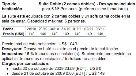 Esta semana cabe destacar la mejora realizada en la tarifa del hotel. Se ha conseguido que las 5 habitaciones suites dobles reservadas, cada una de ellas con capacidad para 6 personas tenga un precio de 149 $/noche... es decir 25$ por persona/noche... realmente económico, no ? y más teniendo en cuenta que es un Hotel de 3 estrellas y en dicho precio esta incluido el desayuno y alguna que otra comodidad (gimnasio, piscina cubierta...)