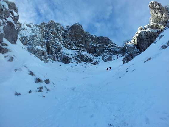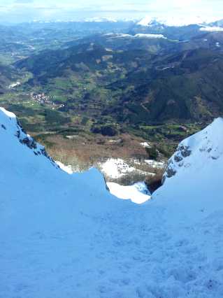 Tras pasar un bosque donde la nieve ya empezaba a acumularse, y siempre con la imagen perfecta de todas las canales que se dirigen tanto al Aizkorri como al Aketegui, llego a la base de la canal principal y veo a bastantes personas metidas en faena.