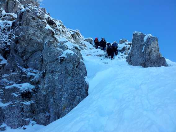 Algunos bajando, otros parados en mitad de la dura pendiente, colocándose los crampones, y otros dándose la vuelta por distintas razones, el espectáculo empieza a gustarme.
