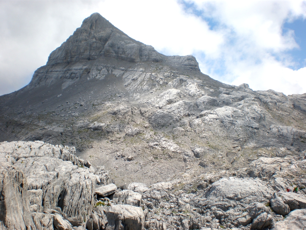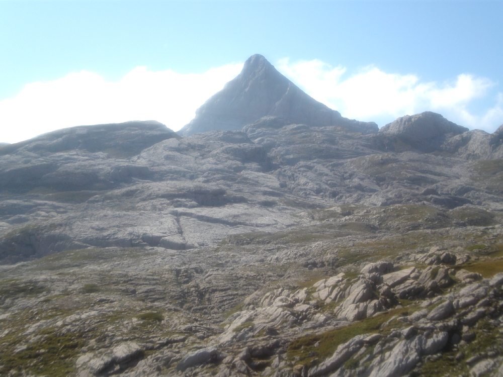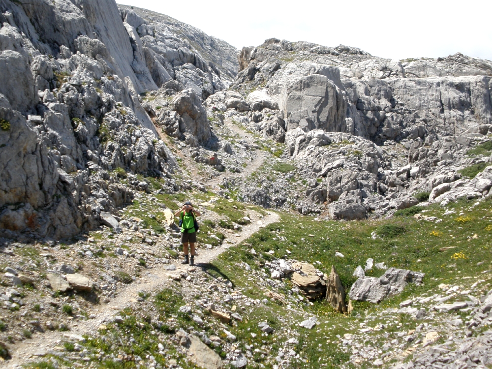 Adentrándonos en el glaciar de piedra (zona kárstica) tenemos que prestar atención en no tropezar en esta zona llena de simas. Ya no hay rastro de senderos. Nos tenemos que guiar por las marcar rojas o por los continuos mojones. Es una zona en la que es fácil perderse con niebla. Peligroso hacerlo en primavera-otoño ya que hay poca nieve. El paisaje formado por las rocas, impresionante.