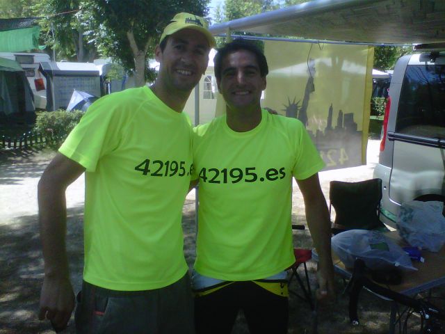 Cuando el sol calienta nos tomamos lo de correr con filosofía. 2,5 km hasta la presa y volver. Presa, prisa, pausa. En el cruce con 2 compis del 42195.es apretamos para ves si conseguimos una llegada "à trois". Pobre iluso. Este tren del triatlón no espera a nadie, y cada segundo hay que ganarselo.