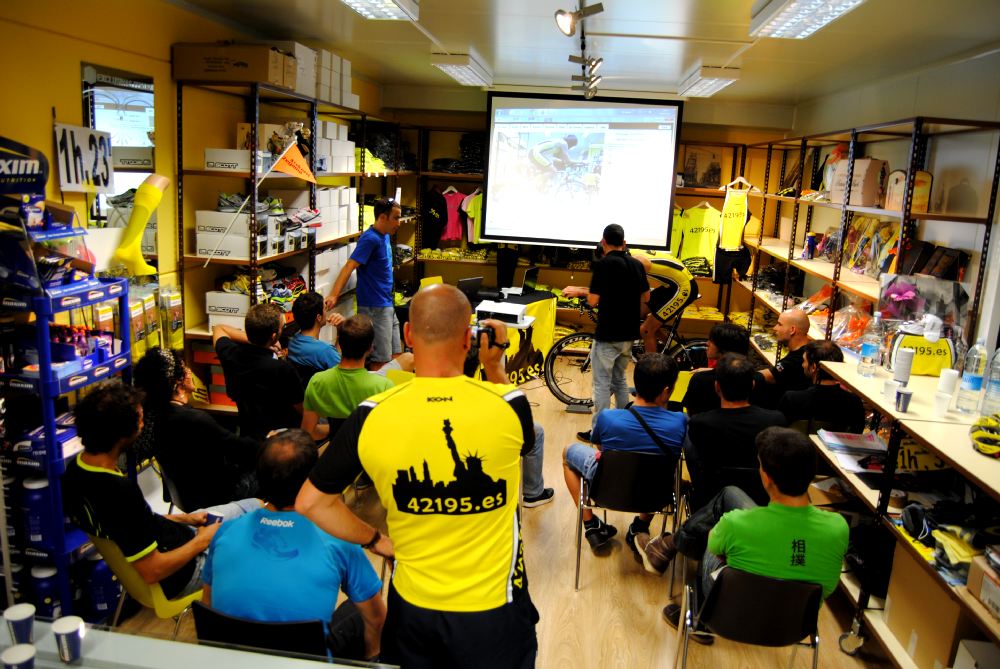 Tanto el pedaleo del triatleta como los datos recabados por el sistema se proyectaron en una pantalla, de forma que los asistentes pudieron seguir la evolución del ajuste, ayudados por las explicaciones de Hektor Llanos. Eneko Llanos también participó en la explicación, resolviendo dudas relativas al sistema de ajuste y respondiendo a pregundas generales de triatlón.
