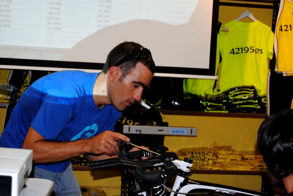 La exhibición consistió en el análisis postural del ciclista para ajustar las medidas de la bicicleta a la posición de "acople" en el triatlón. Para ello Hektor Llanos realizó en primer lugar un examen anatómico del triatleta, y posteriormente desarrolló el trabajo de ajuste de la bici con la tecnología puntera de Retül Bike Fit System.