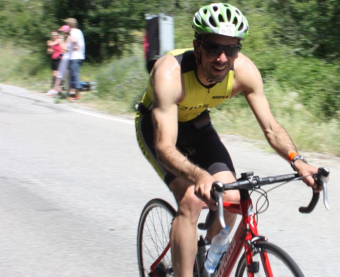 Disfruté desde la primera pedalada hasta la última. Me veía bien, sin excesivo desgaste, muy feliz, en un entorno precioso, animado porque la media por hora rondaba los 30 kilómetros cuando tenía prevista una media no superior a 25, adelantando constantemente más que siendo adelantado, centrado en beber los dos bidones con gel diluido de forma regular. A mitad del Col de l‘Ecre me esperaban Igor e Imanol con sus ánimos, tras coronar el Col me paré un minuto en la zona en la que se acumulaban las bolsas de comida personalizada y cogí una manzana, en el kilómetro 120 me volví a encontrar con mis dos amigos (no me canso de repetir que no había nadie en carrera con un equipo de apoyo como el formado por estos dos queridos amigos mungiarras), poco después me crucé con Willy que me llevaba unos kilómetros de ventaja, la bajada era lo suficientemente peligrosa y larga como para no aburrirse y, cuando ya las piernas y el cuerpo empezaban a pedir con cierta insistencia un cambio radical de posición, sólo quedaba apretar los dientes para pelear contra el viento de los últimos 20 kilómetros. Esta última parte se me hizo dura. Además de las horas acumuladas de esfuerzo que empezaban a hacer acto de presencia, el sol castigaba con fuerza y me quedé sin líquido ya que en la bajada se me había caído el botellín de agua que había cogido en el último avituallamiento. En cualquier caso, el optimismo me arrastraba y me daba fuerzas ya que veía que bajaba de las 6 horas y, por tanto, me salía un parcial superior a 30 kilómetros por hora. Y así fue, 5 horas 58 minutos y 30 segundos. Para mi nivel en bici, mucho mejor de lo soñado (querido Jon, esto es en gran parte mérito tuyo).