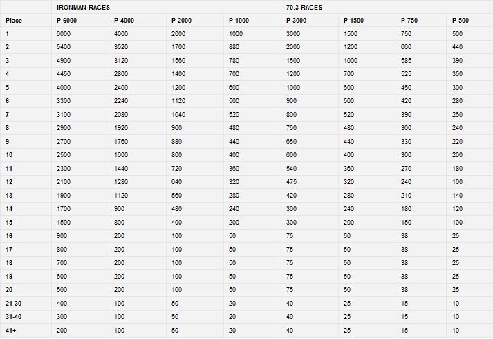 Así, en distancia IronMan se distingue entre pruebas en las que el primer clasificado puede conseguir 6.000 puntos (P-6000), 4.000 puntos (P-4000), 2.000 puntos (P-2000) y 1.000 puntos (P-1000). En distancia Half-IronMan se pueden conseguir hasta 3.000 puntos (P-3000), 1.500 puntos (P-1500), 750 puntos (P-750) y 500 puntos (P-500), si bien sólo hay 7 pruebas del circuito que puntuan.