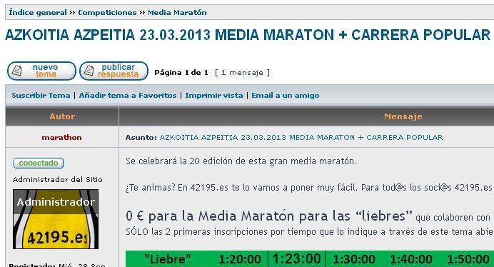 0 € para la Media Maratón para las “liebres” que colaboren con la organización corriendo con 42195.es. SÓLO las 2 primeras inscripciones por tiempo que lo indique a través del tema abierto en el foro 42195.es. Tiempos previstos: