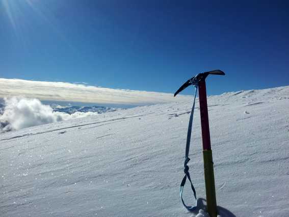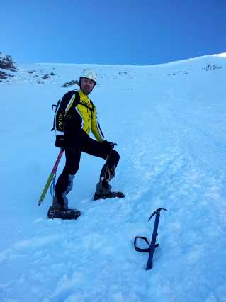 Ellos me advierten de la tremenda pendiente y de lo helada que esta la nieve, así que saco el otro piolet, y me armo de valor y ganas.