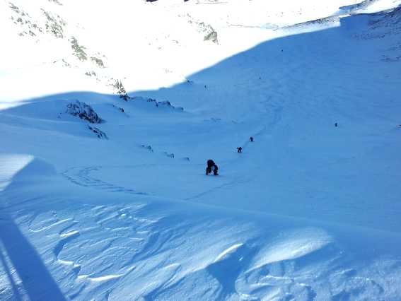 En el descenso me paro justo en la zona por donde yo salí, y animo a un chaval que subía por la misma huella que había abierto yo poco antes. Por detrás venia mas gente.