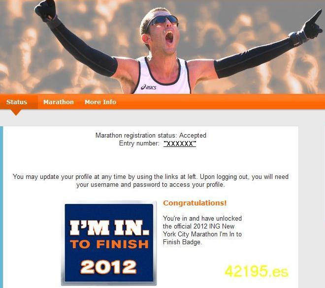 "Para averiguar si has sido aceptado para el próximo Maratón de Nueva York el 4 de noviembre 2012 visite hoy, 25 de abril, la página web tv.nyrr.org retransmitirá en directo el sorteo desde Columbus Circle de Nueva York.