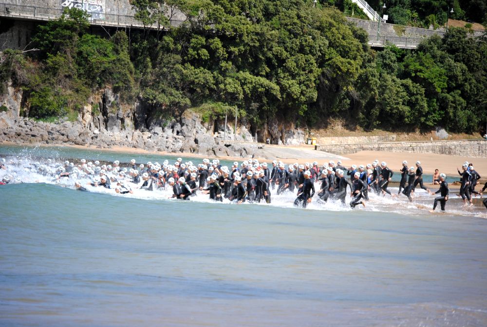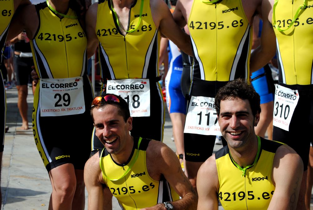 Antes paso a despedirme de la familia y amigos, postrados en el restaurante, como que con ellos no va la competición. Se me hincha el pecho, todos me animan y yo me siento crecido ante tanto ánimo. Me voy a la playa ya sólo. Me encuentro con los compañeros de la familia 42195.es.Alvaro, Iñigo, Ramón, Jon Arrarte, Diego, Juan, Jon, y Silvia nuestra chica del club, que también debutaba en triatlón.