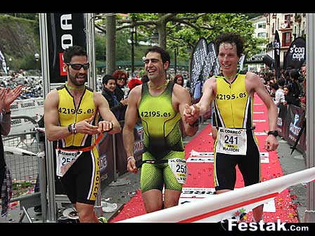 De ellos 312 consiguieron llegar al bonito pueblo vizcaino de Ondarroa y en un día un poco desapacible cruzar la línea de meta. Entre ellos un grupo importante de 15 triatletas 42195.es. Darles la más sincera enhorabuena por el ejemplo que muestran para l@s que algún día probaremos el deporte del 3 en 1.