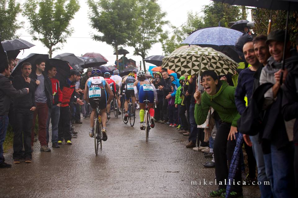 En la primera parte (9km corriendo) la lluvia no nos incordió demasiado, y eso, y la buena compañía que llevaba corriendo (Guille, Josu y Kike), hicieron que aumentará mi motivación. Llegamos a boxes, salimos con la bici hacía ese nuevo recorrido de dos vueltas, desconocido para mi. Era una larga y bonita subida en la que cada vez llovía más, y en la que me hizo mucha ilusión ver bajar el puerto a los primeros, y descubrir que entre ellos estaba Maikel. Parecía que el circuito iba a ser divertido y la lluvia, a pesar de que ahí estaba, no incordiaría mucho, aunque se empezaba a notar frío. Lo malo fue cuando empezamos a bajar y empezamos a notar que quitar peso viene muy bien para subir, pero muy mal para bajar, por el frío. La segunda mitad de la primera vuelta la hice pensando en dejarlo al llegar a Zarauz, pero al llegar allí había entrado algo en calor y decidí repetir, algo menos motivado, al menos pensando en que el entreno fuera de 82km y no de 41km.