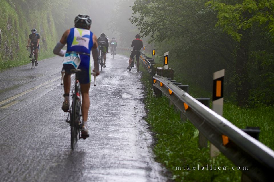 En la subida ya notaba que cada vez llovía más y el frío mayor... y eso sin empezar a bajar. Oía ambulancias por todas partes lo cual imaginaba que eran caídas bajando o retirada por frío. Llegué arriba y al empezar a bajar ya me di cuenta que la cosa no iba a ser tan fácil como en la primera vuelta. Las piernas agarrotadas del frío, la carretera encharcada, curvas, hojas y frío, mucho frío... hasta tal punto que de la tiritona me temblaba la bici. Tanto frío pasé que estaba deseando llegar a las escarpadas cuestas del camping para entrar un poco en calor. Y sólo pensaba en una ducha caliente, en que eso no me aportaba nada, que no era un triatlón, que me daba igual llegar a meta y sobretodo, que no me estaba divirtiendo. Así que al llegar al box, colgué la bici y me fui directo al hotel a darme una larga ducha calentita, que fue lo mejor del día.
