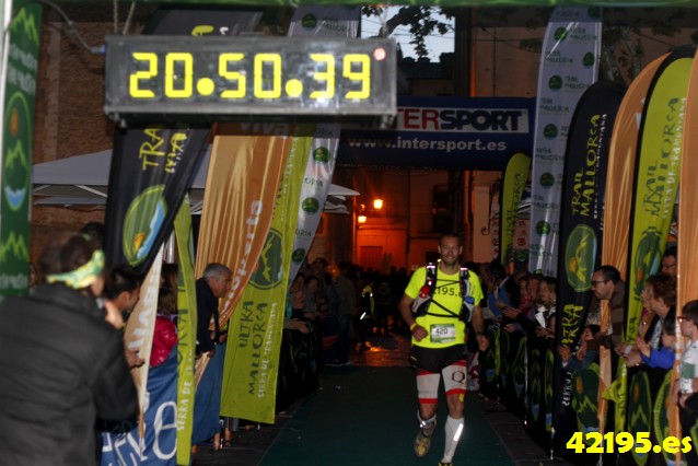 A 2 Kms de meta me llama por teléfono Heri, que viene a buscarme, enseguida le veo y me anima, que ya estamos cerca..., me cuenta que está muy emocionado por haber terminado la Trail, que hay mucha gente en la meta, están todos los amigos y mi mujer esperando, vaya detallazo que tubo el amigo Heri. Le digo que me avísame cuando queden 200 metros para empezar a correr, las entradas a meta siempre hay que hacerlas corriendo, pero tenía que dosificar porque ya no había nada de nada dentro de mi, ni un poquito de fuerza. Callejeando llegamos a la Plaza de Pollensa y de repente me encuentro con los focos de la meta y la gente gritando. Una entrada muy emocionante después de 20 horas y 50 minutos.
