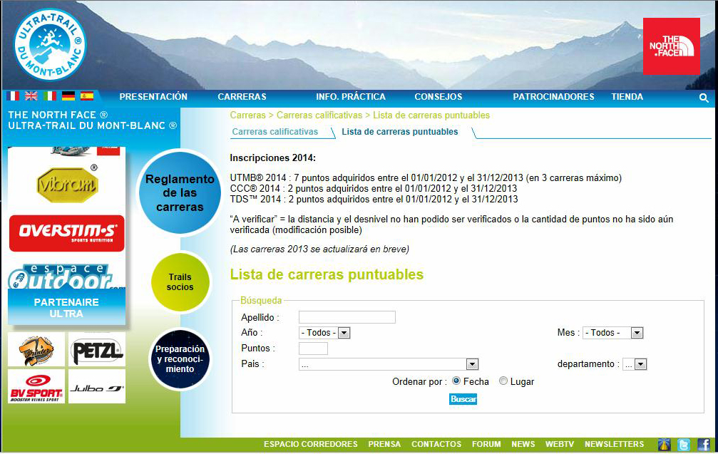 Para inscribirse en el UTMB® 2014, es necesario haber acumulado un mínimo de 7 puntos habiendo finalizado, entre el 01/01/2012 y el 31/12/2013 exclusivamente (*), carreras incluidas en esta lista. Los 7 puntos deben haber sido acumulados en 3 carreras máximo.