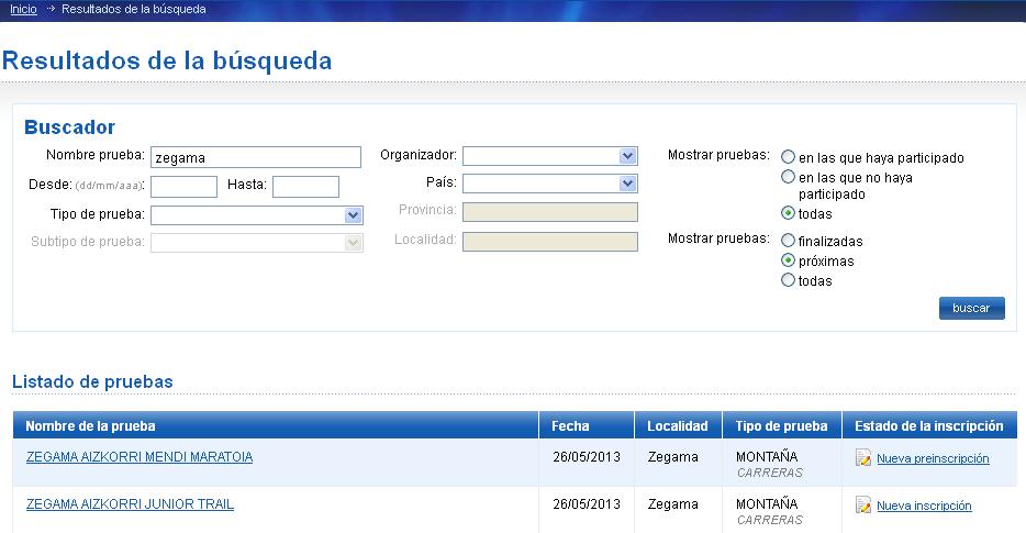 3.- En "Nombre prueba" indicar "Zegama" y pulsar la opción "Buscar". Luego clicar la opción de la derecha "Nueva preinscripción"